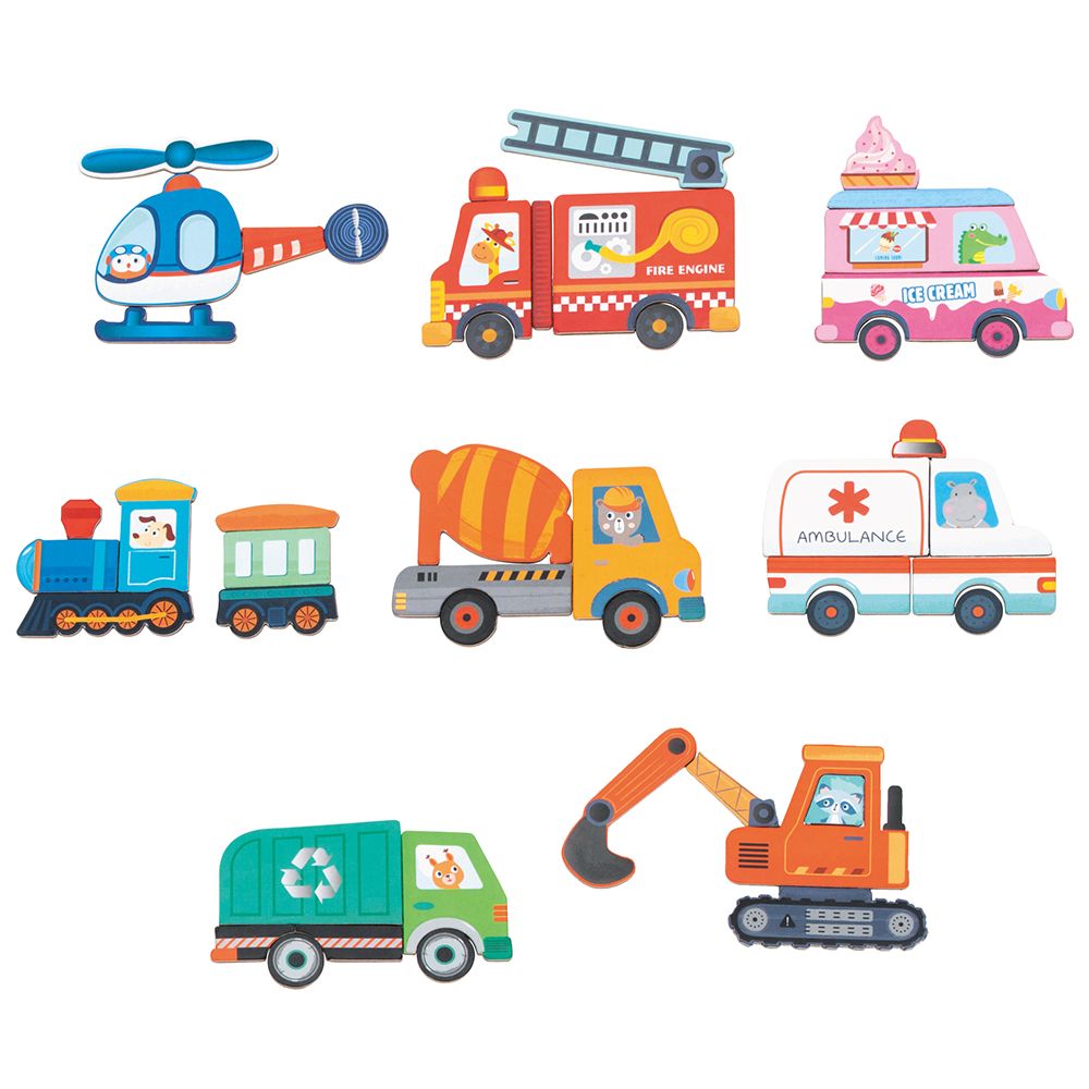 Забавна детска игра с 48 магнитни превозни средства и 8 примерни карти, които ще послужат на децата като модели, които да направят, докато сами се научат как да си съпоставят правилно върху магнитната дъска.