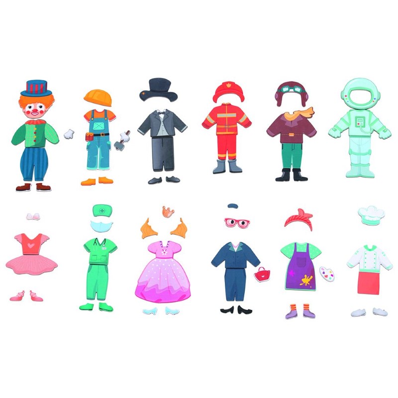 Комплектът съдържа 64 броя магнитни дрехи за обличане и аксесоари, както и 12 карти с магнит, които децата да гледат, докато играят. Магнитните части могат да се залепват и върху всяка друга магнитна или метална повърхност.