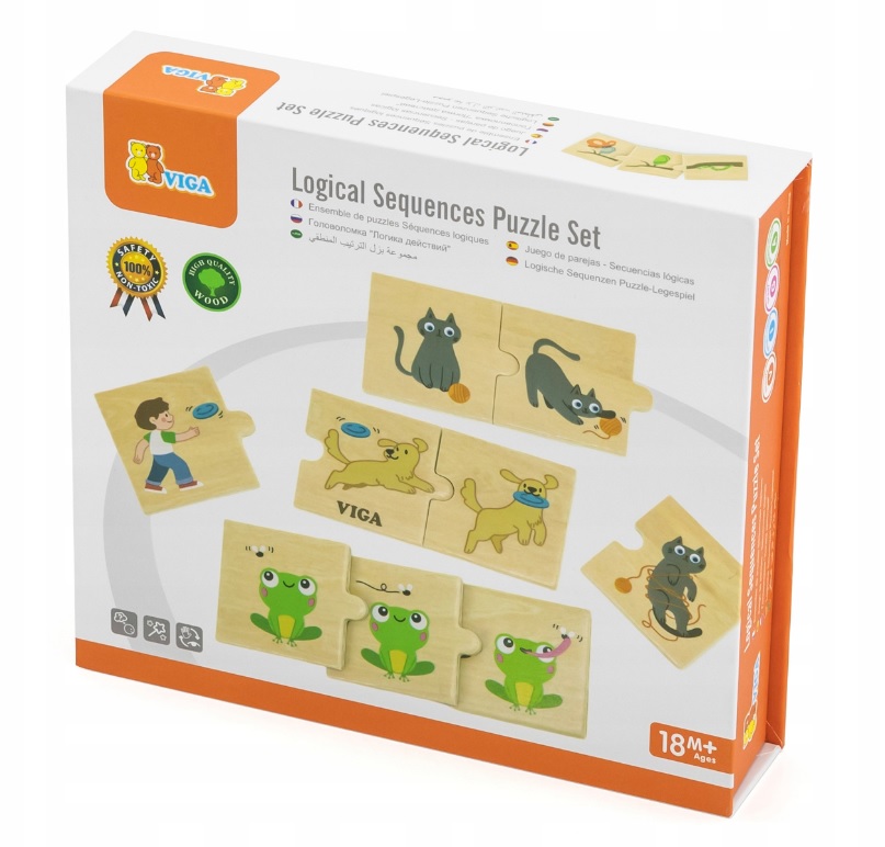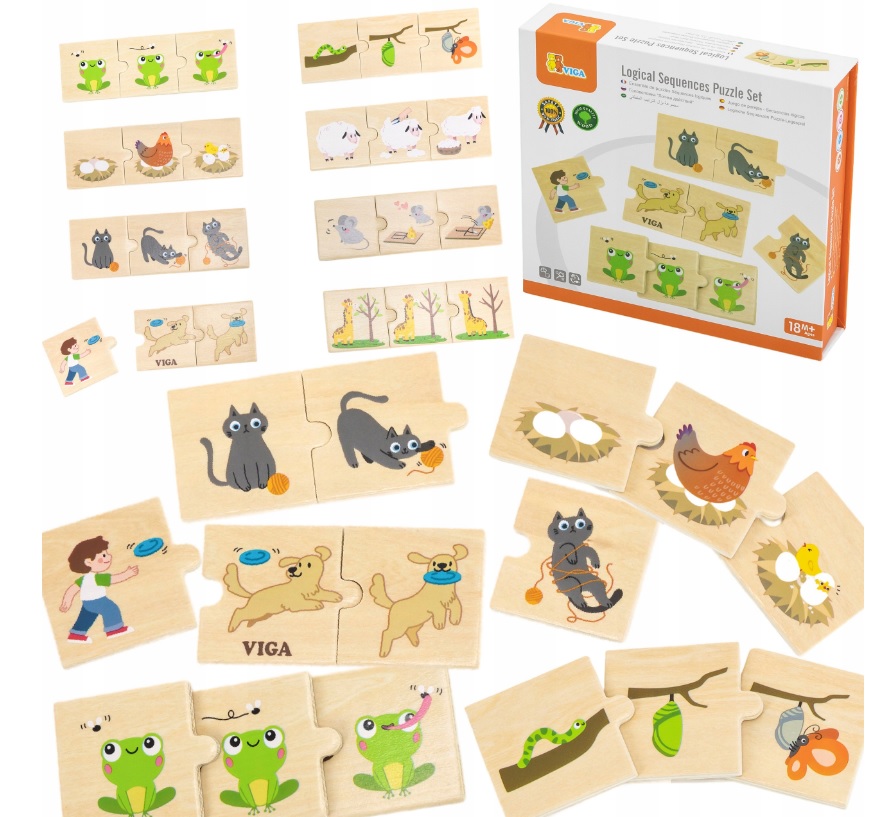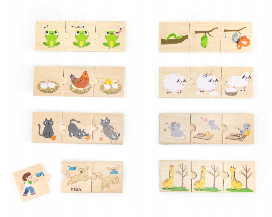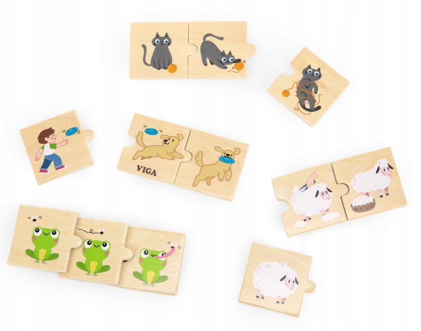 Дървеният логически пъзел от VIGA е пъзел, в който детето трябва да свърже 8 комплекта цветни части от пъзел с дейности, извършвани от животни, като донасяне от куче или ядене на растения от дървета от жираф. Това е страхотно занимание за децата, което им позволява да учат и затвърдят знанията си за разпознаване и описание на дадена дейност.