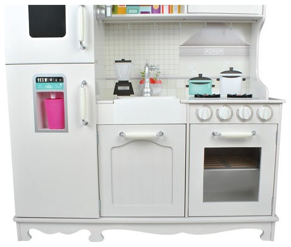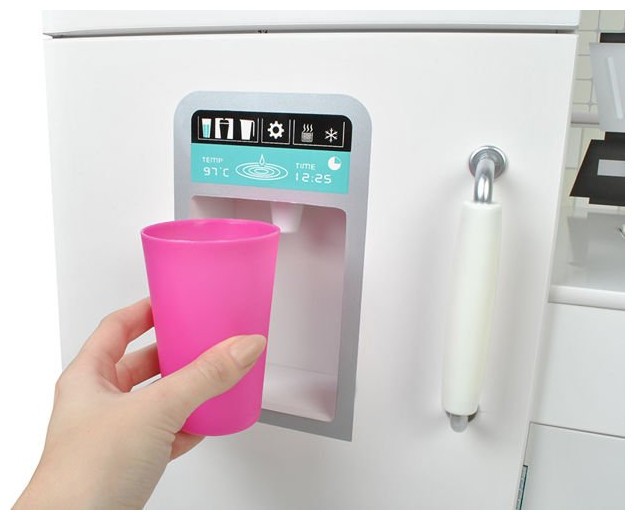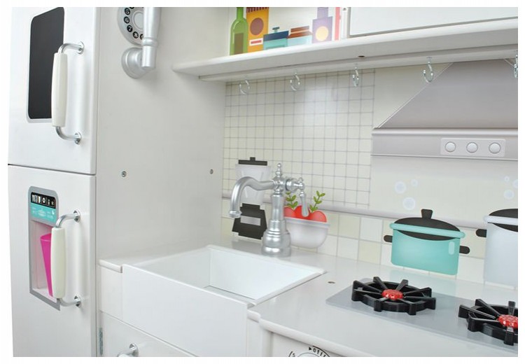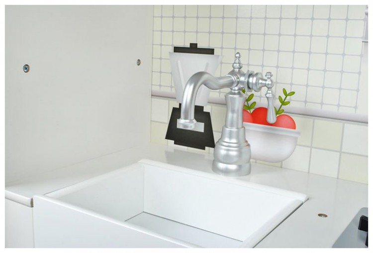 Подвижните елементи като плъзгащи се врати и бутони за щракване са друго предимство. Продуктът има много атрактивен външен вид. Много прецизната изработка, заедно с естетичен завършек и грижа за най-малкия детайл радват окото. Благодарение на елегантния, бял цвят и декоративните крачета, кухнята може да служи и като красива декорация в стаята на детето.