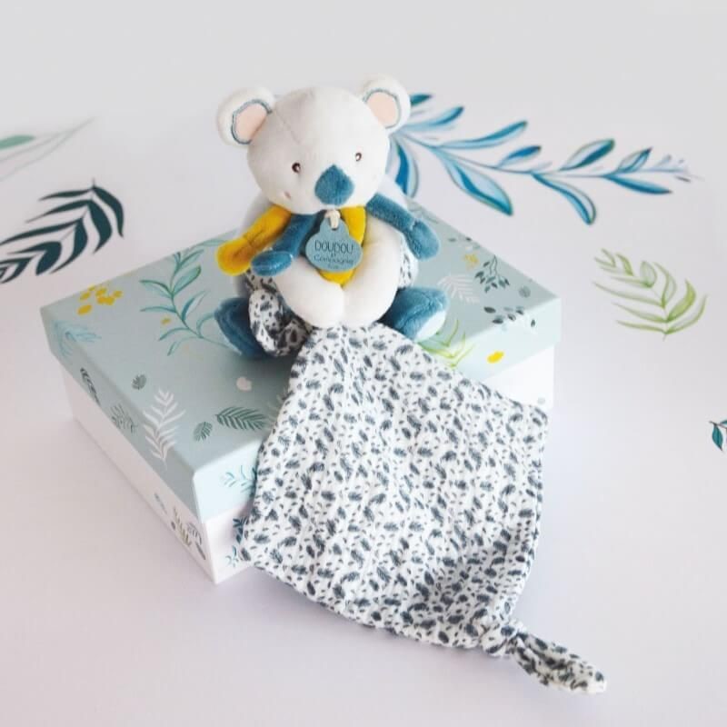 Плюшената коала с кърпичка от френската марка Doudou е създадена с внимание към най-фините детайли, за да предложи мекота, естетика и сигурност на всяко бебе. Съчетанието от модерни цветове, деликатни текстури и растителни шарки върху кърпичката я прави едновременно стилна и привлекателна.