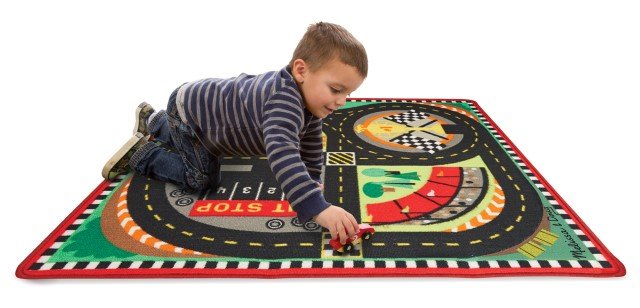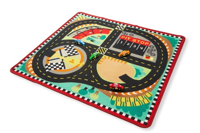 Състезавайте се с автомобили около пистата и преминете през ликуващите тълпи и по целия път го кръга на победителите. Този килим ви предлага много забавни начини за игра. Изработен е от здрави и качествени материали. Има подложка, която го прави безопасен за всякакви повърхности. В комплекта има четири дървени състезателни колички. Изключително голямата му форма е достатъчна за игра от няколко деца и много коли.