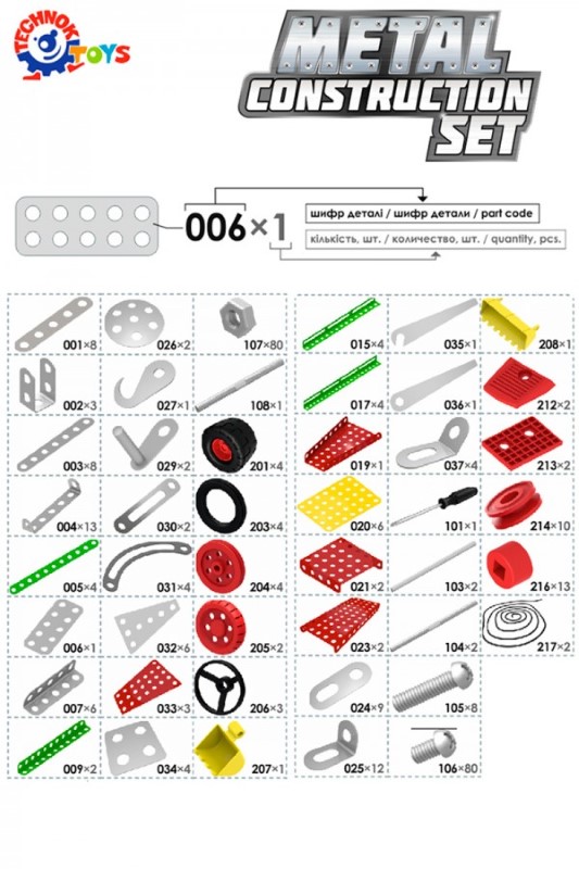 Металните конструктори Technok Toys се отличават с високо качество и разнообразие от части, като предлагат интересна комбинация от метални и пластмасови компоненти. Всеки комплект включва отвертка и ключове за сглобяване на модели.
