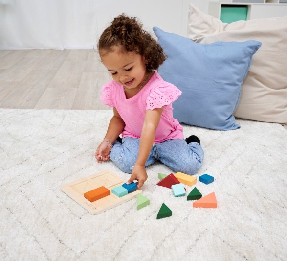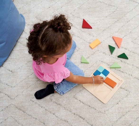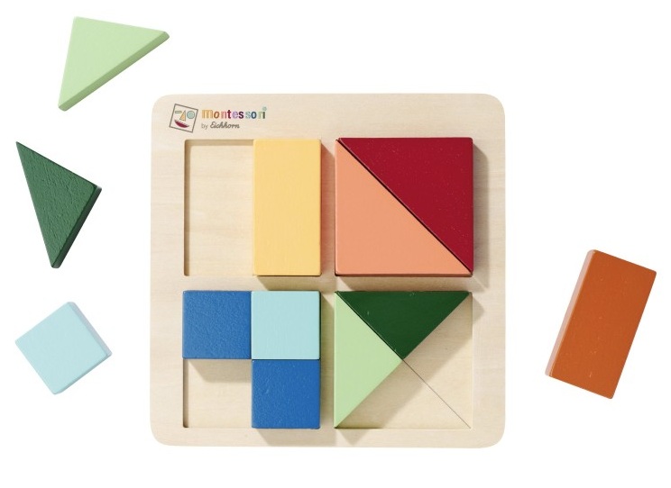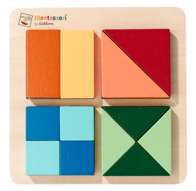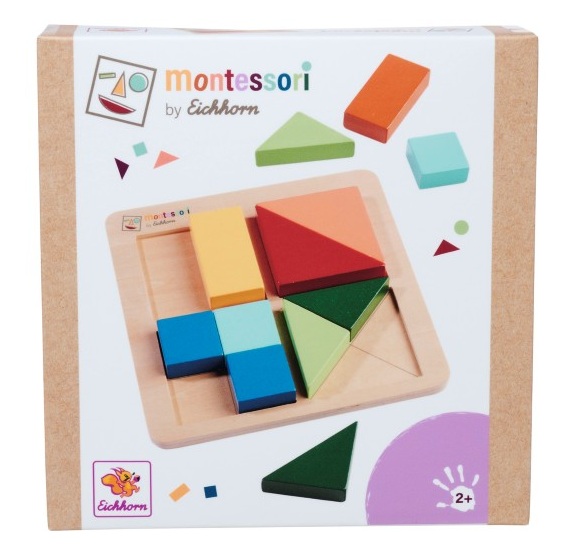 Образователен Монтесори пъзел съдържащ 12 цветни геометрични фигури. Целта на пъзела е да се запълнят квадратите. Парчетата могат да се смесват и в различни цветове.