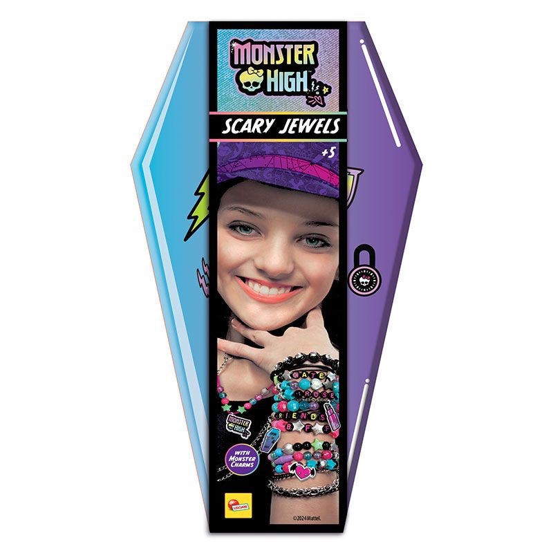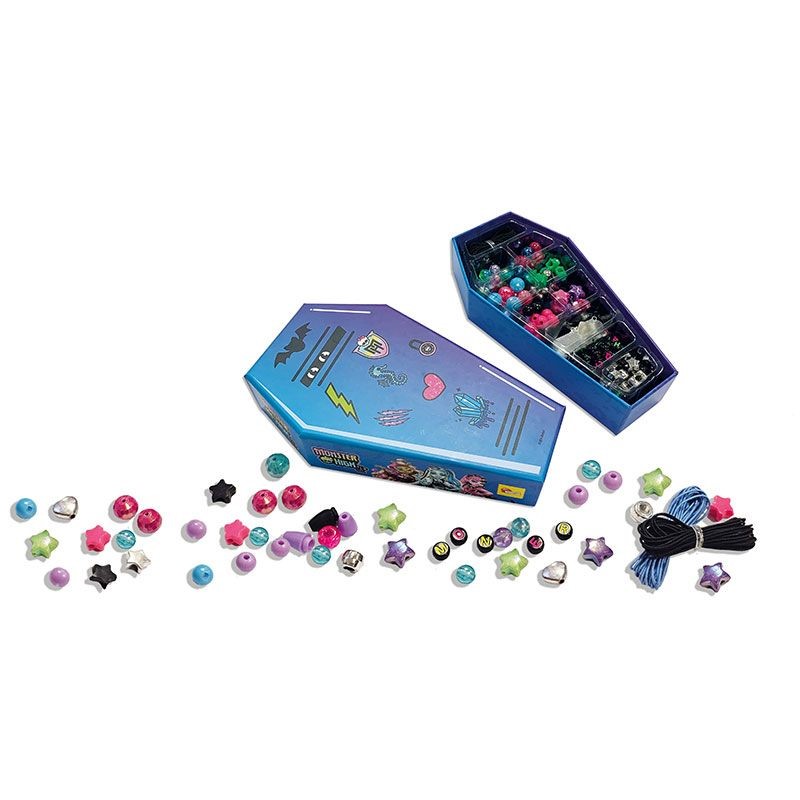 Страшен контейнер с форма на ковчег, пълен с творчески материал за направата на красиви бижута Monster High. В допълнение към цветни мъниста, вътре ще намерите някои много хубави талисмани, за да персонализирате гривни и колиета, които да носите по всеки повод и да ги споделите с когото пожелаете!