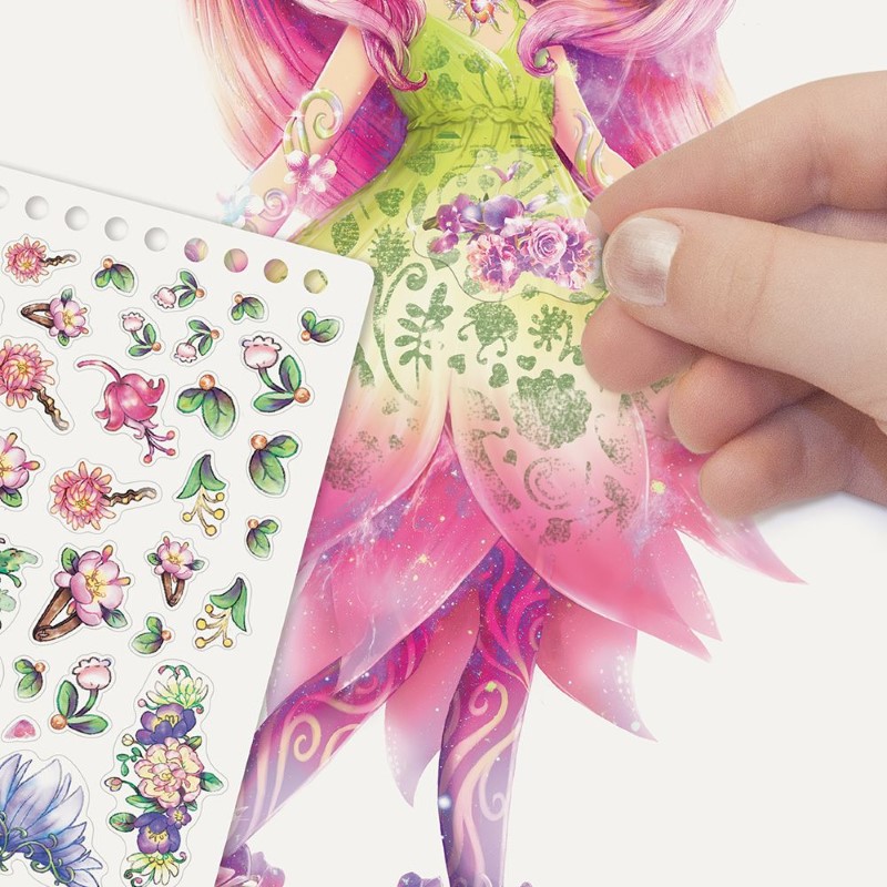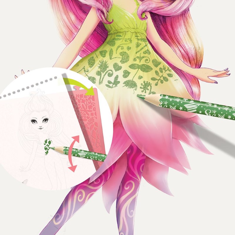 Комплектът съдържа: * 45 листа за скициране; * над 80 шаблона с различни щрихи; * над 80 дизайна; 5 цветни молива; * 8 различни техники за рисуване; * 3 различни секции в книгата; * 2 страници с цветни стикери; * инструкции за комбиниране на цветовете; * разказ на английски език за феята Петулия.