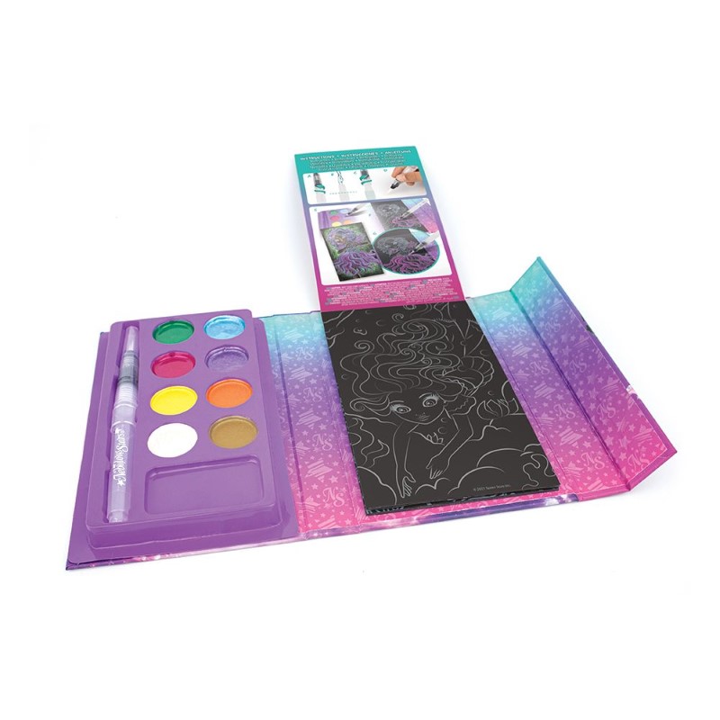 Детски творчески комплект, включващ книжка с 16 черни страници, върху които са очертани различни рисунки, които трябва да се оцветят с помощта на включените в комплекта цветни акварелни бои и четка.