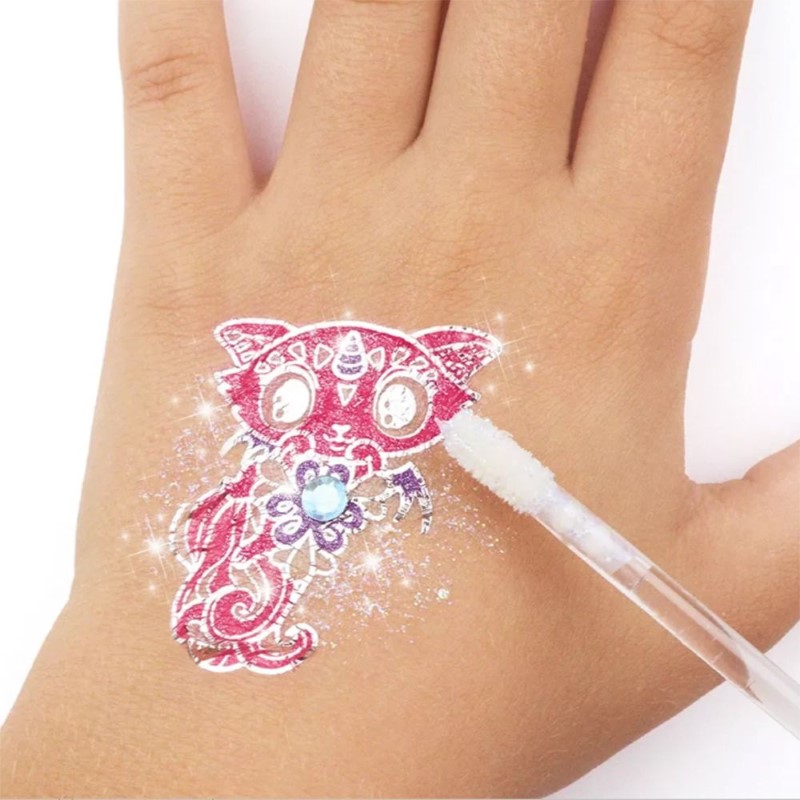 Детски творчески комплект с временни татуировки, с които можете да украсите тялото си с красиви и космически дизайни! Химикалките за татуировки и стикерите с кристали ще ви помогнат да добавите блясък към Вашите татуировки!