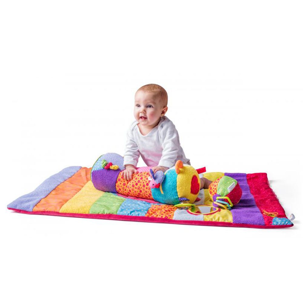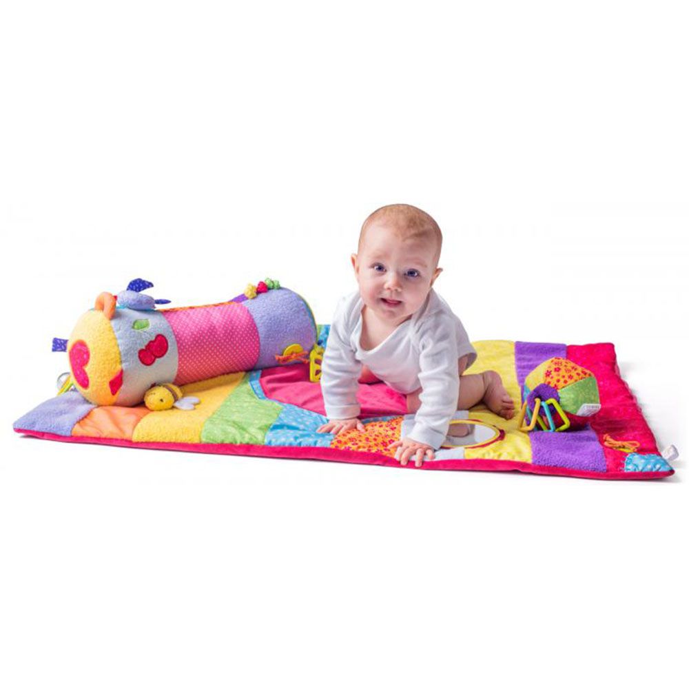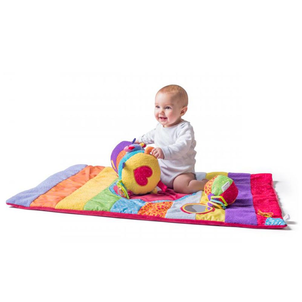 Бебешко меко и цветни килимче с различни текстури, което ще допринесе за забавленията и развитието на вашето бебе. Към килимчето има две допълнителни играчки – бебешка активна топка, изработена от висококачествен текстил, покрита с различни материали с ярки цветове, шумящи части, дрънкалка и гризалка (размер: 11 см) и активна възглавница с различни занимания (размер: 43 см).
