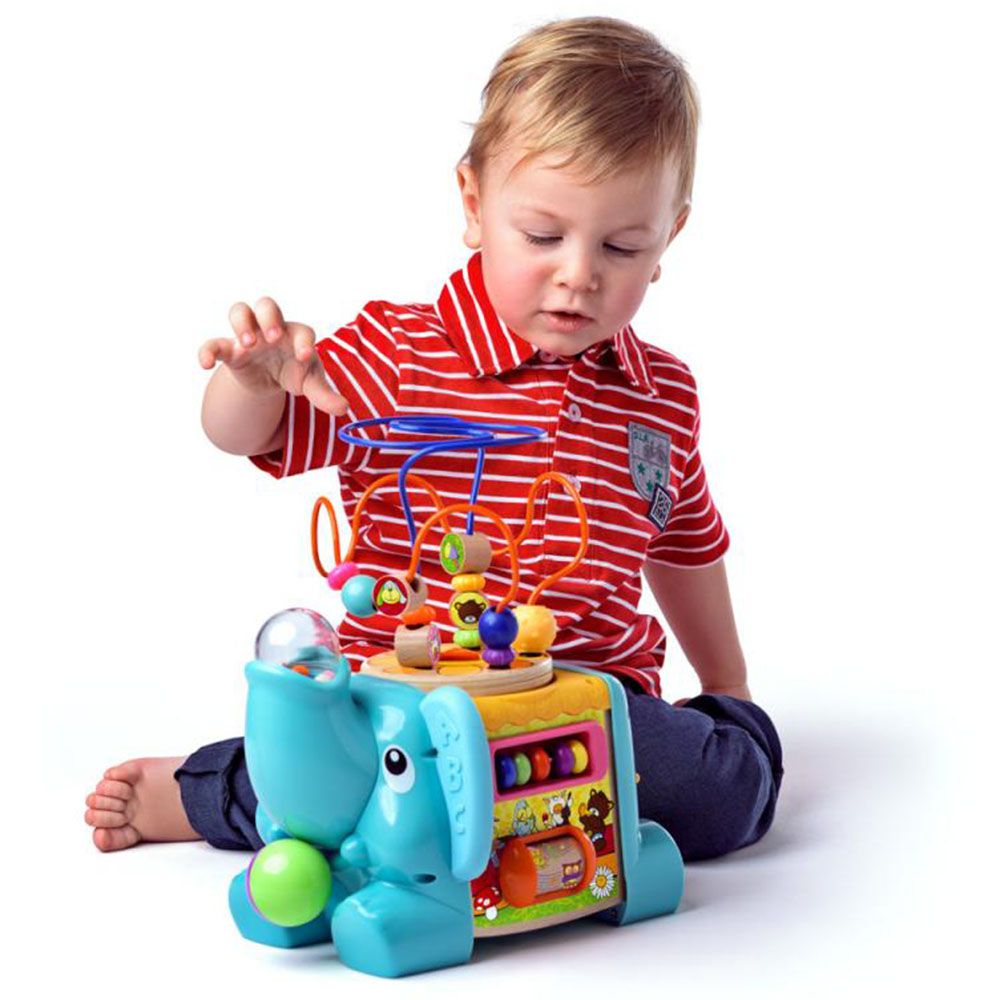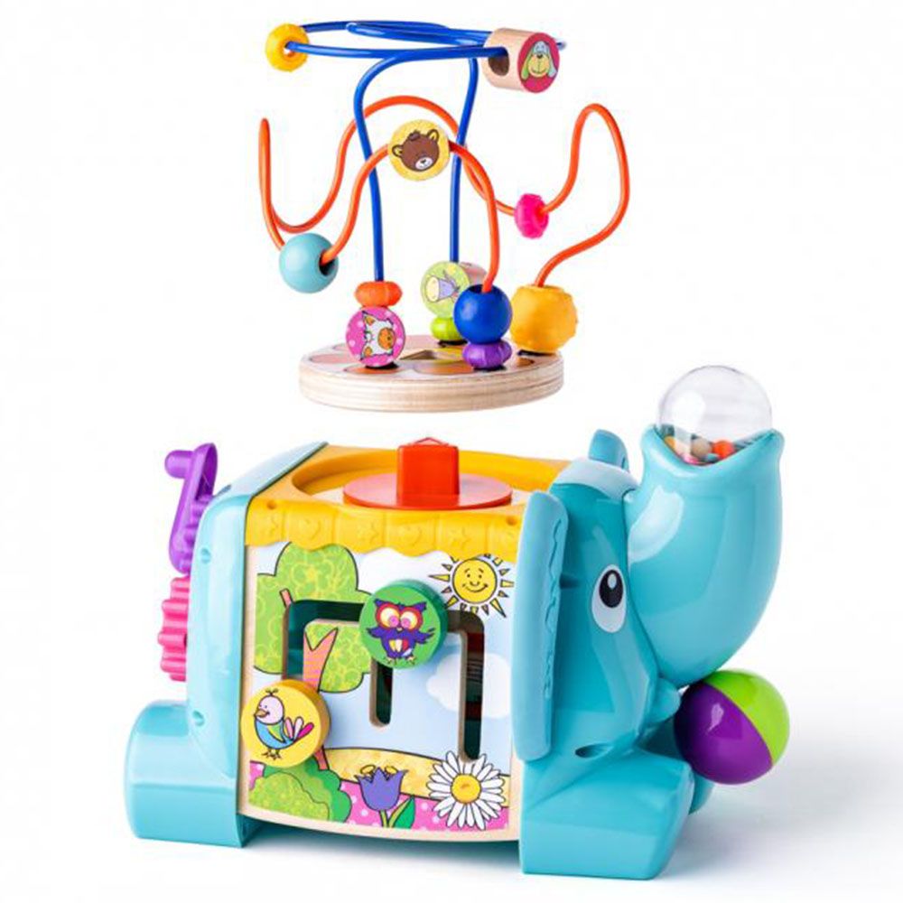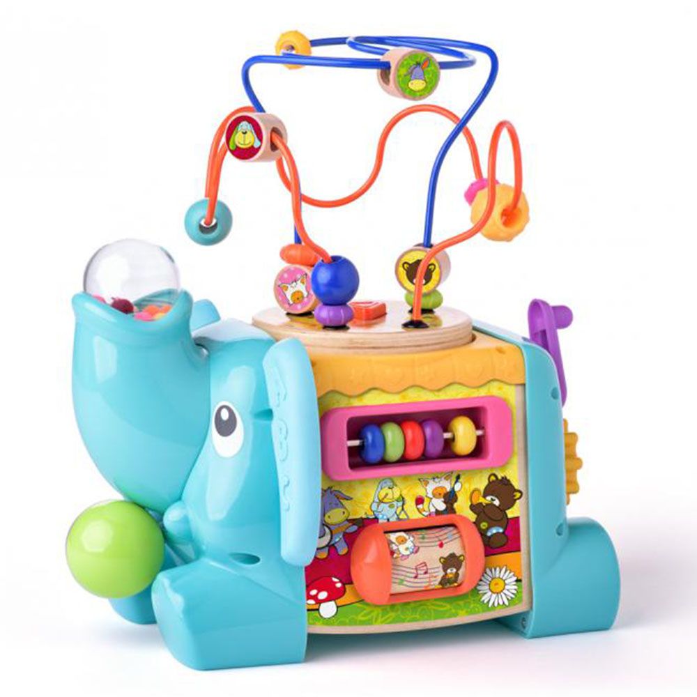Дидактическият куб с лабиринт и други активни занимания под формата на Слонче е перфектен за забавления от малките деца.