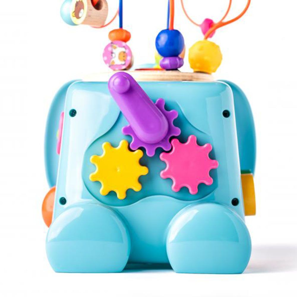 На страните на куба ще откриете различни активности – сметало, лабиринти, зъбни колела и други, които ще развият двигателните умения, фината моторика и логическото мислене на малките деца. Неусетно, чрез игра, детето ще научи и причинно-следствените връзки – издърпай голямата зелена топка и наблюдава каква правят малките топки.