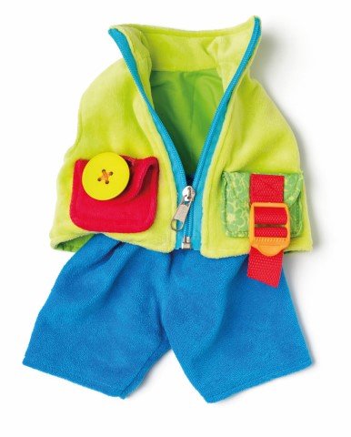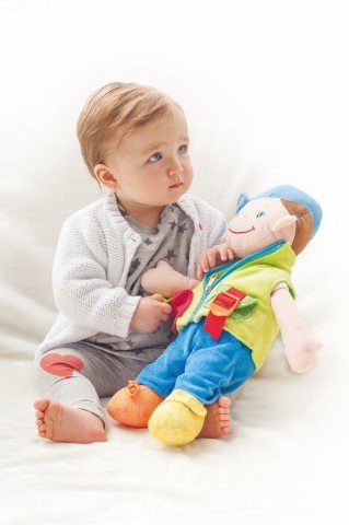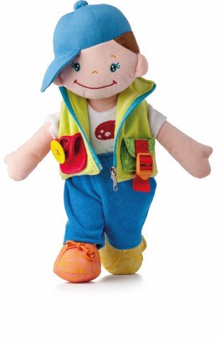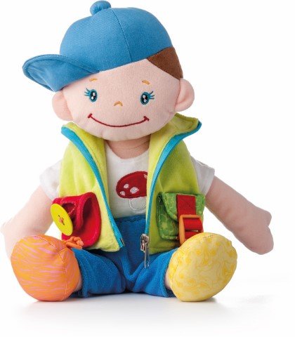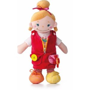 Тази прекрасна кукла е изработена от висококачествен текстил и е предназначена за игра от бебета и малки деца. Дрехите на куклата могат да се събличат и обличат, като закопчалките са с различни копчета, ципове и връзки. Играчката насърчава сензорните усещания и помага за развитието на моториката при децата.