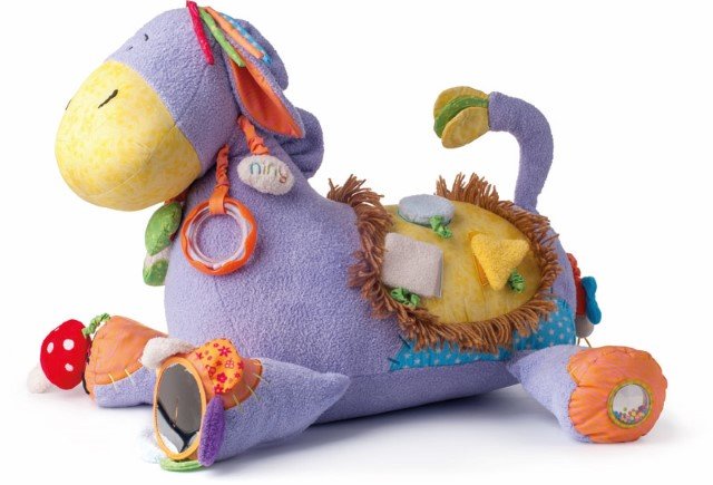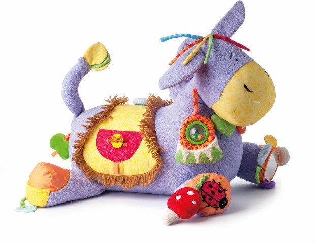 Плюшено шарено магаренце, предназначено за езда и игра от бебета и малки деца. Мекия и нежен на допир плюш, ярките му цветове, шумящи.