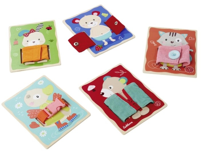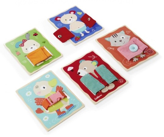 Този комплект включва 5 дъски, оформени като сладки животни като пате, коте, зайче и мече, като всяко едно от тях представлява предизвикателство за закопчаване на дреха: независимо дали е копче, цип, велкро закопчалка, тик-так закопчалка или катарама – има много за откриване и изпробване!