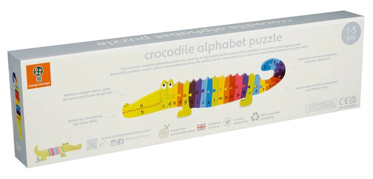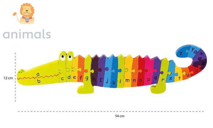 Красиво ръчно рисувани в ярки цветове, дървените части на пъзела са с перфектния размер, за да могат малките ръчички да ги разглобяват и сглобяват отново, докато учат буквите. Проектиран е за да осигури часове на забавление, като същевременно стимулира ключови двигателни умения и насърчава разпознаването на букви.