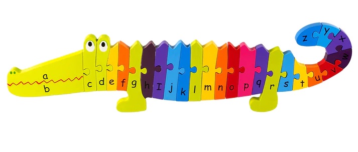Образователен дървен пъзел под формата на крокодил, върху който са изписани всички букви от английската азбука.