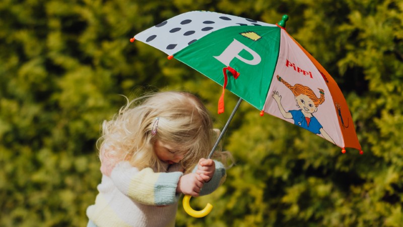 Детски чадър със забавни шарки и весели цветове с мотиви на Пипи Дългото чорапче, който ще запази децата сухи през дъждовните дни.