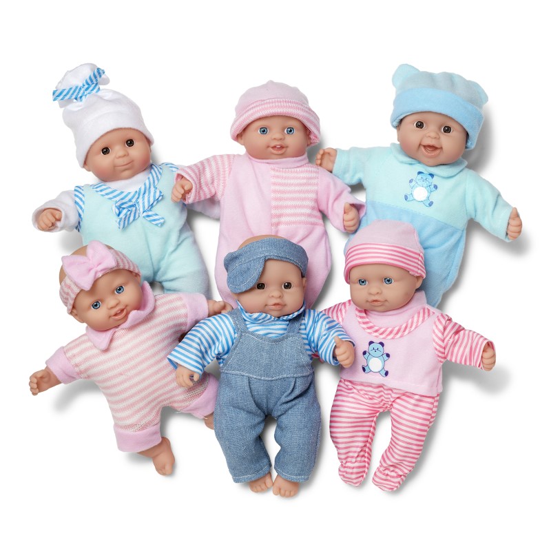 Меки кукли – бебета, облечени в розови или сини дрешки, като всяка от тях е с различна мимика на лицето. Очичките на куклата не се затварят. Материал: текстил, PVC.