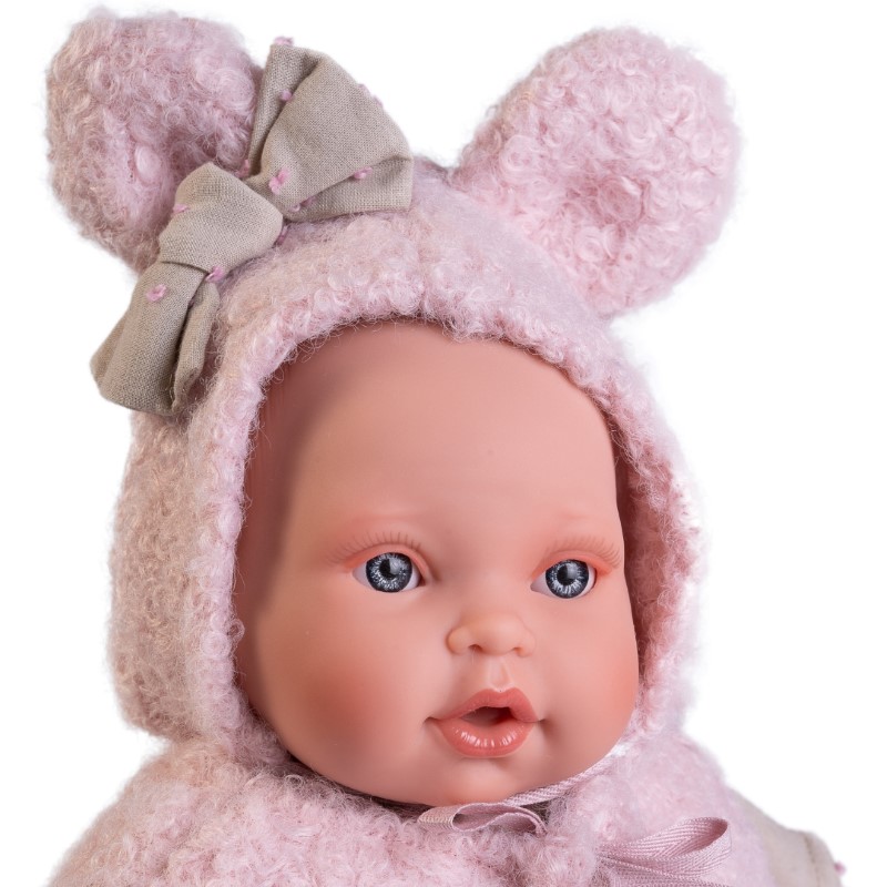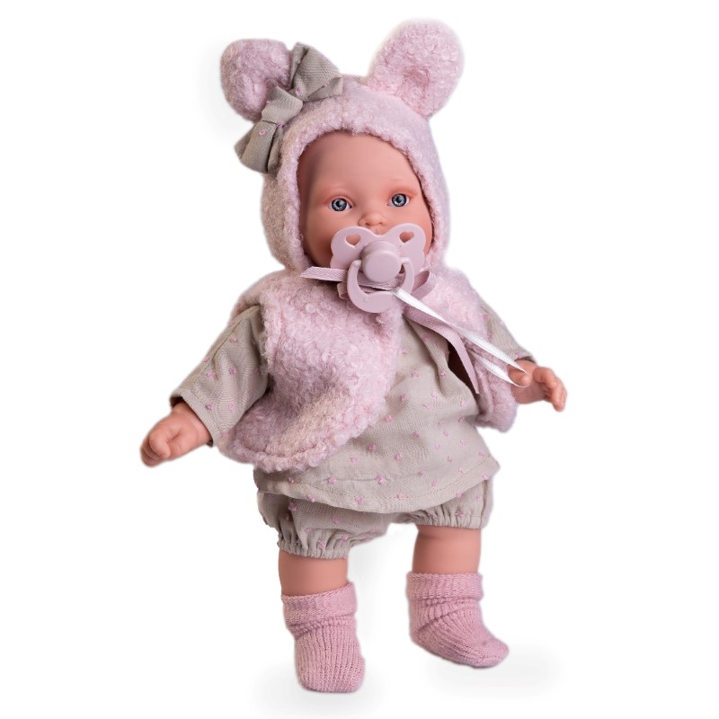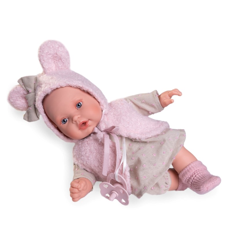 Кика е сладка кукла-бебе, която е облечена с много красив тоалет – блузка с късите панталони и мека розова жилетката с ушички.