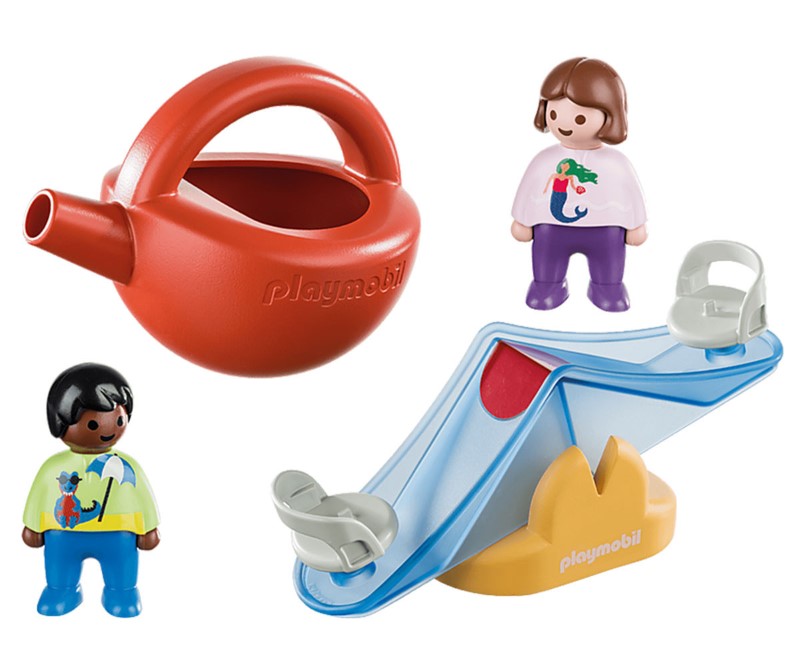 Фигурите се движат нагоре и надолу чрез изливане на вода с лейката върху червената точка. Може да се комбинира с Playmobil – Водна въртележка.