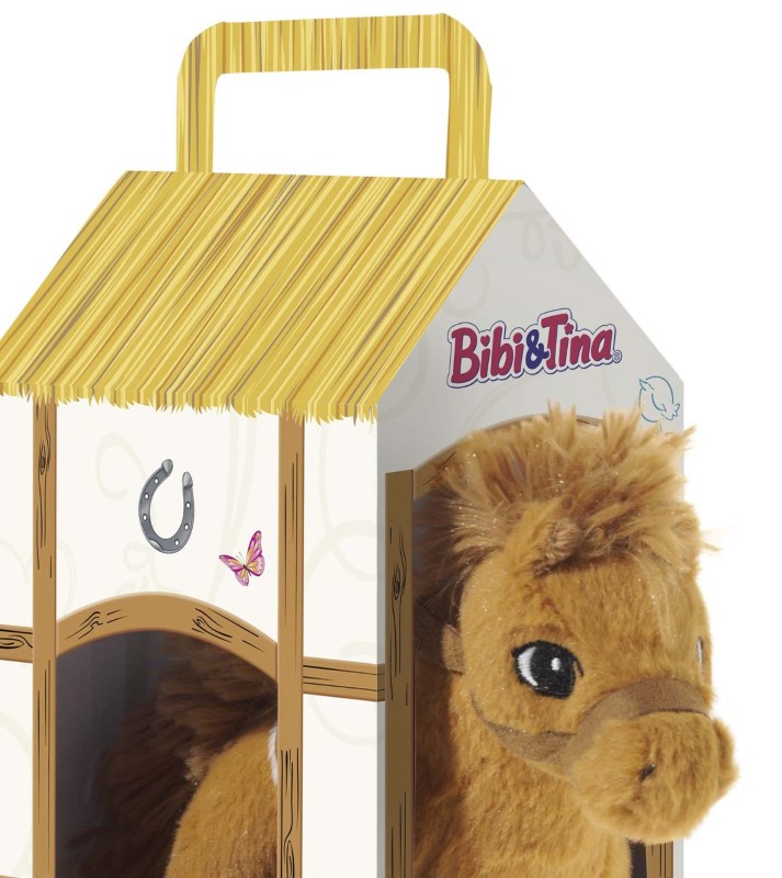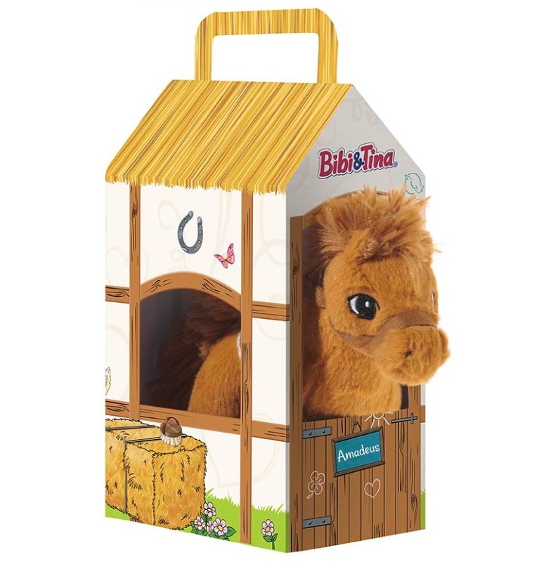Меко плюшено кафяво конче Амадеус с грива и големи, бродирани очи. То ще препусне в галоп и ще се включи е многобройните игри на децата Ви. Има декоративна картонена чанта, която може да послужи и за негова конюшня.