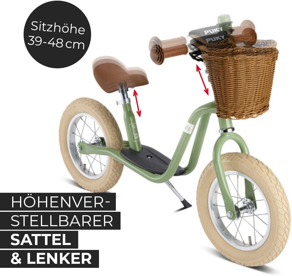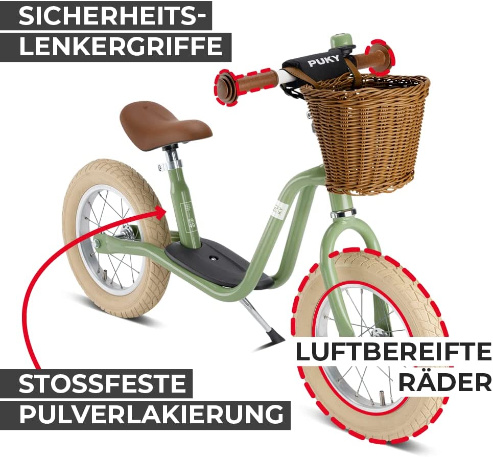 Детско колело за баланс с кошница за багаж от серията Puky LR XL Classic, подходящo за деца на възраст 3+ години, с височина между от 95 до 130 см и дължина на разкрача между 39 – 52 см. Колелото е с ергономична седалка.
