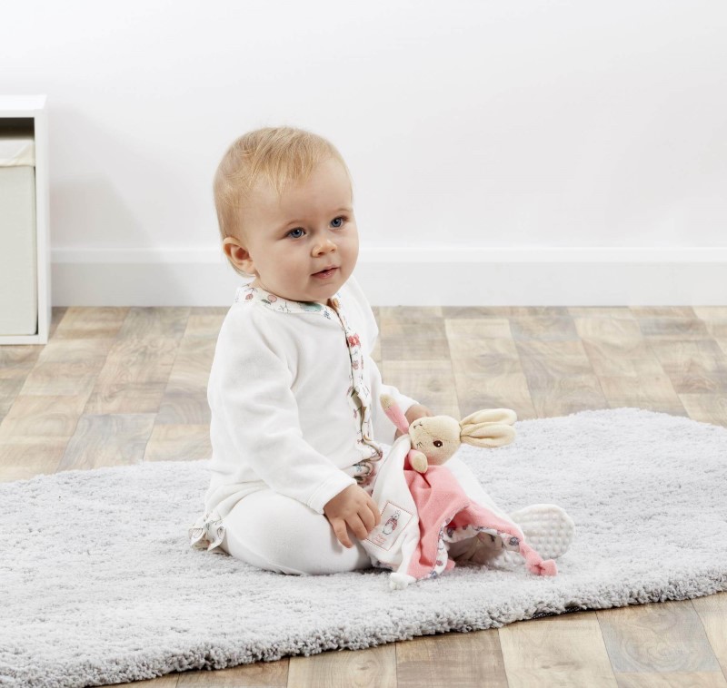 Отличаваща се с илюстриран модел на Зайчето Флопси на гърба, както и със сладки бродирани елементи и завързани ъгли за насърчаване на сензорната игра, тази играчка е идеалният първи спътник за малкото дете.