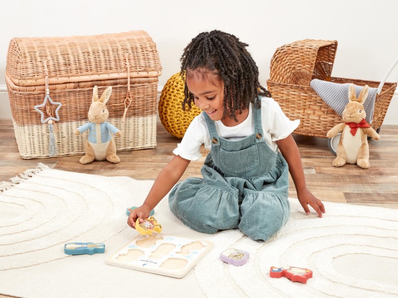 Този игрив, привлекателен пъзел за сортиране на дървени фигури се състой от 5 части и включва някои от най-известните герои на Беатрикс Потър. Малчуганите могат да се насладят и да се запознаят с приятелите на Зайчето Питър, Джемайма Пудъл-Дък, Мис Туиги Уинкъл, Джереми Фишър и Зайчето Бенджамин.