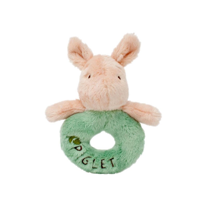 Мека плюшена дрънкалка с пръстен с изображението на Прасчо от приказките на А. А. Милн, която ще стопли сърцето на всяко бебе.