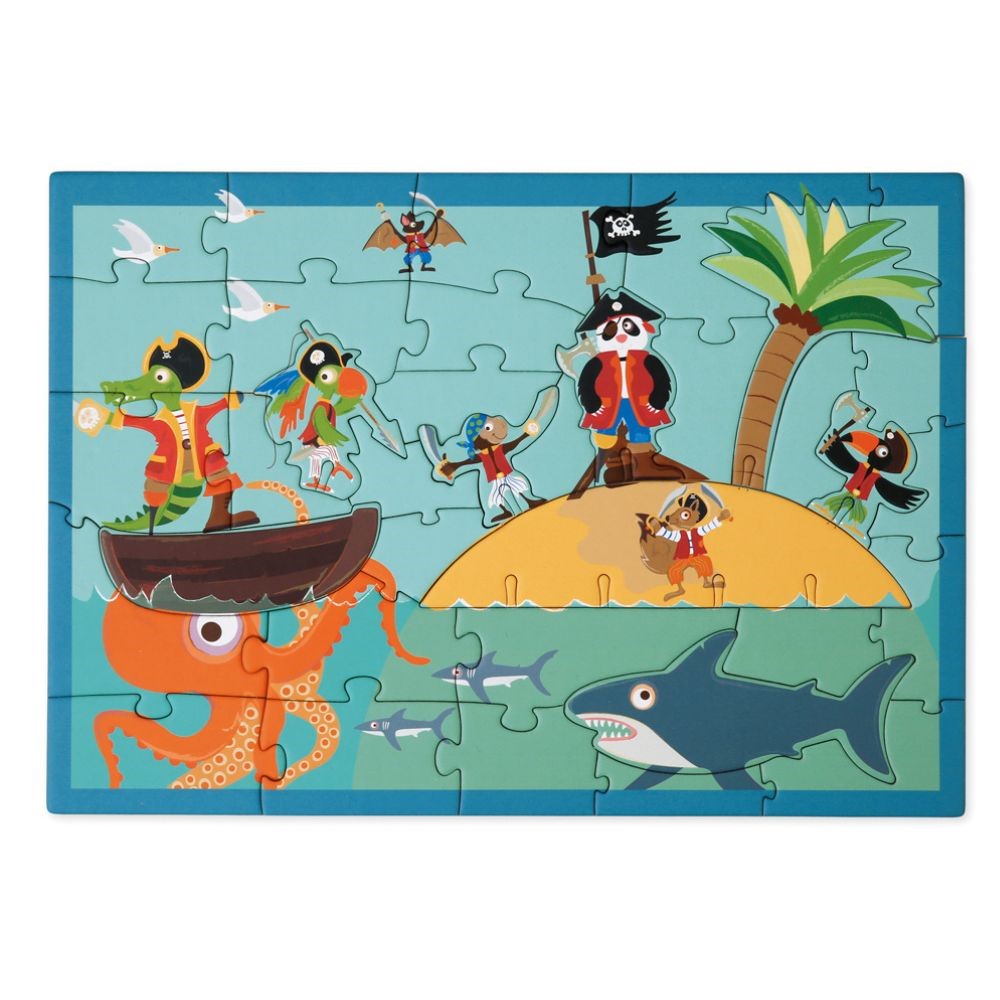 Детски пъзел, с който децата могат да си подредят картина с приключенски образ на банда пирати в морето и на сушата.