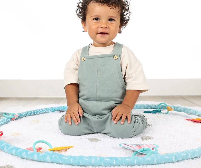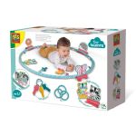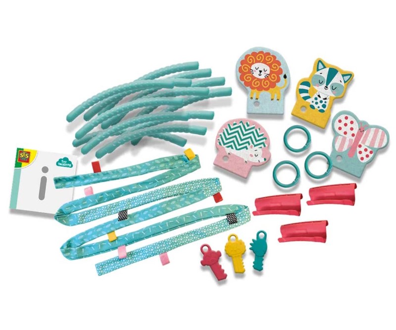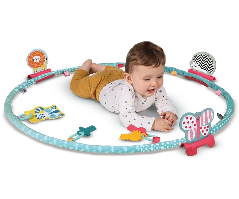 Обръчът има мек ръкав, изработен от плат и девет забавни играчки. С помощта на различни звуци, ярко оцветени играчки с различни форми, детето ще се научи да координира движенията си. То ще посяга с ръчичките си към играчките, ще изучава света около себе си и ще тренира своите двигателни умения. Трите забавни ключа/гризалки са безопасни за захапване и носят допълнителен комфорт при никнене на зъбки.