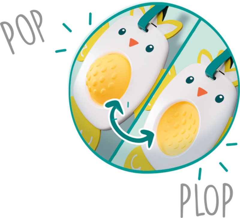 Това сладко птиче има меко тяло от филц. Когато натиснете коремчето навътре и навън то издава пукащ звук, който ще привлича вниманието на детето. Различните текстури, материали и пукащия звук, правят птичката идеална първа играчка!