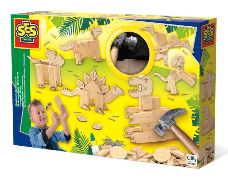 Комплектът съдържа истински чук и пирони, предварително нарязани дървени шаблони, лепило и подробни инструкции за конструирането на динозаврите. Следвайки стъпките, сами или с малко помощ, децата ще си направят T-Rex, Стегозавър и Птеранодон.