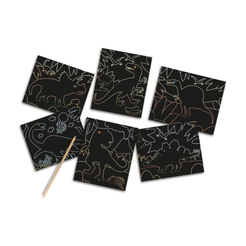 Страхотни светещи в тъмното скреч карти, които разкриват различни динозаври. С дървената писалка за драскане децата могат да драскат шарки, пера и люспи, и да откриват всички детайли, които са скрити под черните скреч картини. По този начин децата могат да измислят различни динозаври. Закачете ги в детската стая, за да могат да се наслаждават на ефекта от фосфорната светлина, която излъчва скреч карата.