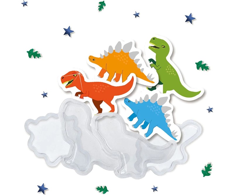 Оцветете вашите динозаври, като ги поставите във формата, сложете от различни пайети, и като последен щрих сложете малко от сребристото блестящо лепило отгоре.