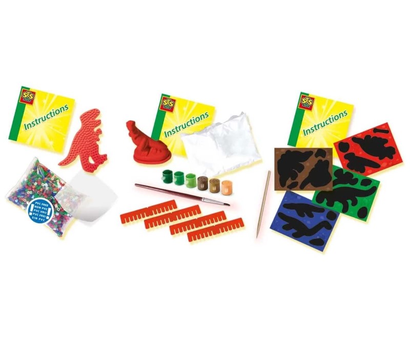Този комплект ви позволява да направите различни видове динозаври с мъниста. Съдържа също и скреч карти, които с помощта на дървена писалка ще откриете динозаврите които се крият там. Третата дейност от комплект е за отливки от гипс на 3D T-Rex. Просто смесете гипса с вода, изчакайте да изсъхне и след това преминете към оцветяването на динозавъра. За по голям ефект можете да използвате малката гъба от комплекта.
