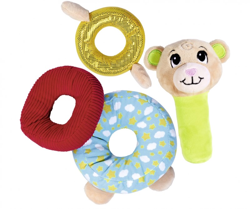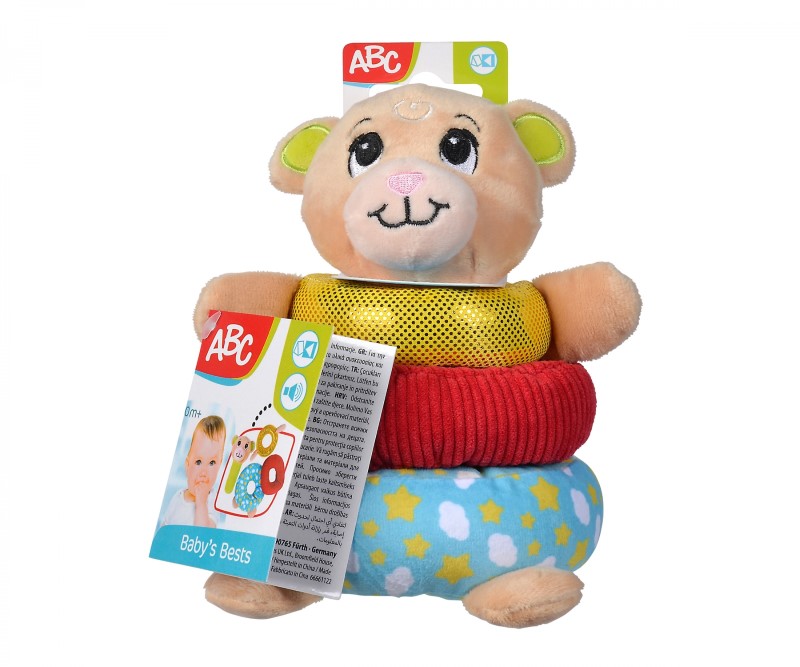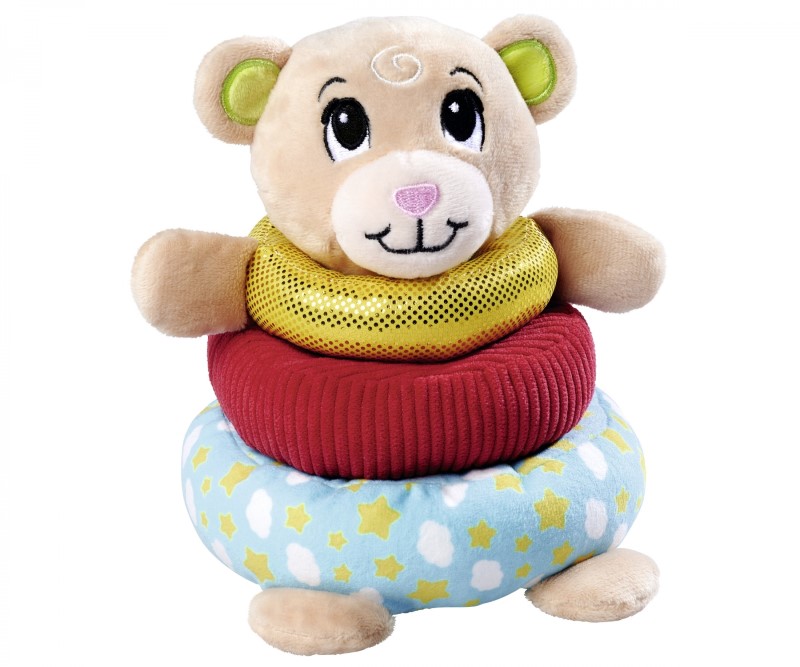 Плюшено мече с рингове за нанизване, което се състои от три меки плюшени пръстена и играчка за хващане. Пръстените могат да бъдат подредени по ред на размера и поставени върху играчката за хващане.