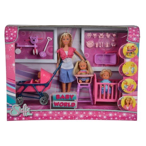 Стефи има нужда от вашата помощ за да се погрижи за нейните 3 прекрасни дечица. Комплектът включва: 1 кукла барби, 3 мини кукли/бебета, количка за близнаци, детска легло, столче за хранене и други дребни аксесоари.