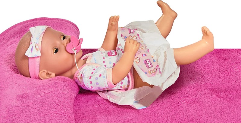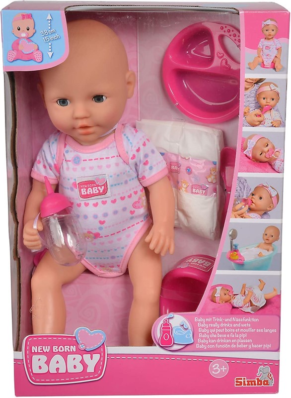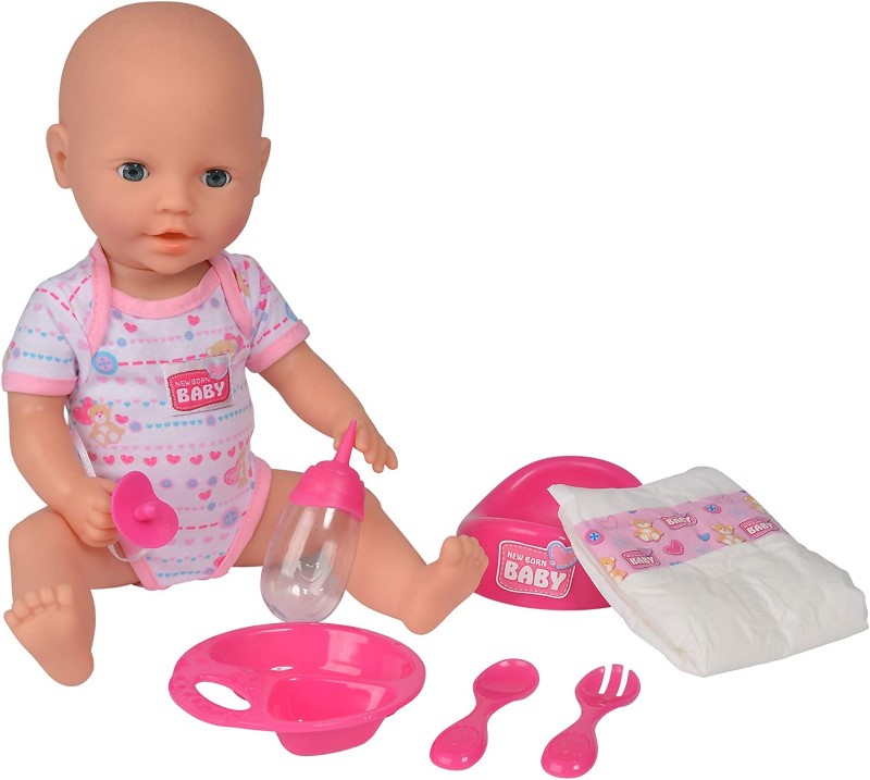 Това сладко новородено бебе е с височина 38 см и е облечено в сладко розово боди и ще дойде при вас заедно със своите аксесоари за хранене. Куклата може да пие вода от своето шишенце, да ходи по-по малка нужда на гърне. Има си и памперс, който можете да и слагате, когато се навън на разходка. Комплектът включва още пелена, лигавник, залъгалка и прибори за хранене.