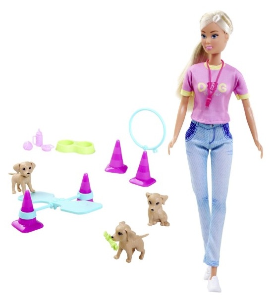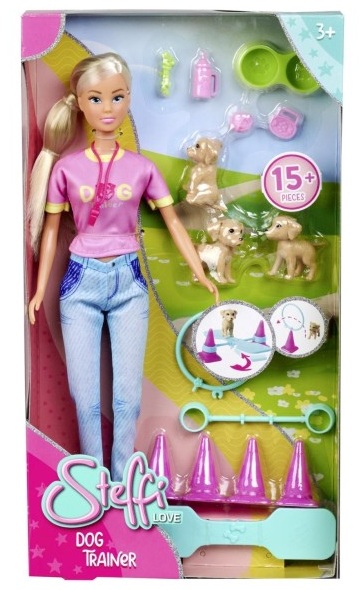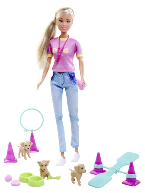 Куклата Стефи е известна с това, че много обича кученцата. Облечена с удобни дрехи – дънки и тениска, тя ще влезне в ролята на треньор и ще научи трите си любими кученца на различни трикове, с включените в комплекта аксесоари за дресиране.