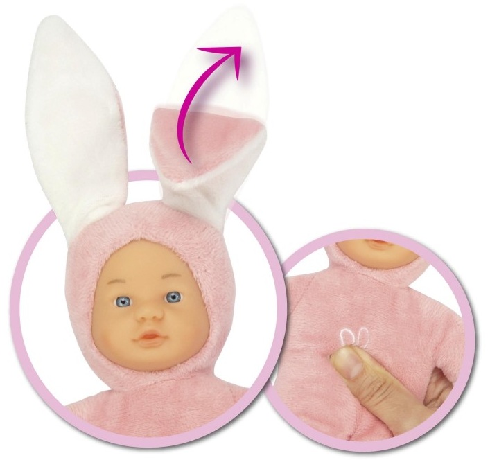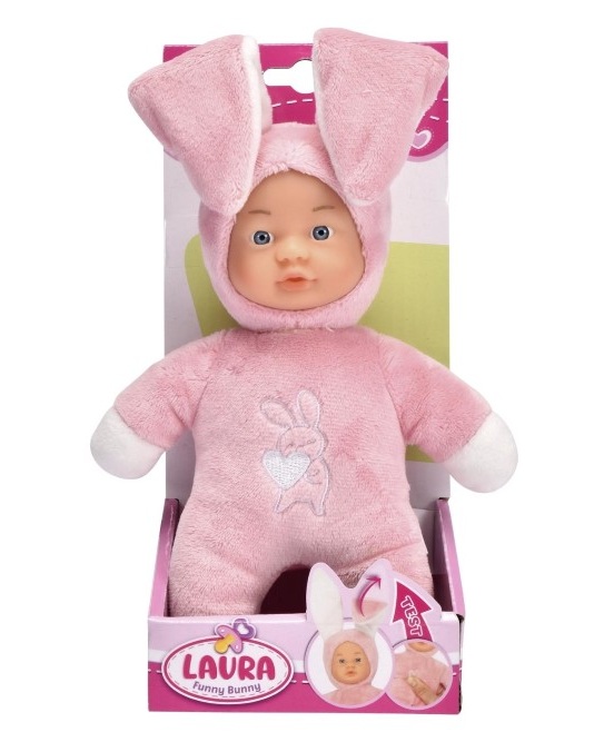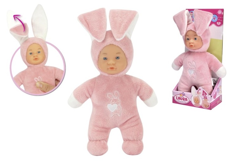 Меката кукла Лаура е облечена като сладко розово зайче. Тя е с меко тяло и ако натиснете коремчето й, заешките уши ще се вдигнат нагоре. Тази сладка кукла ще се превърне в любима играчка на дечицата и ще ги придружава по време на сън.