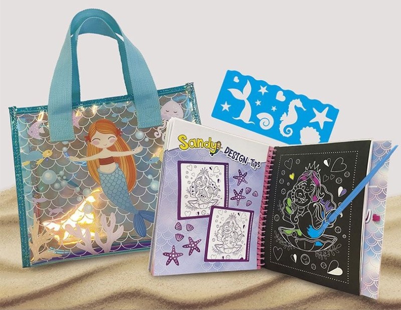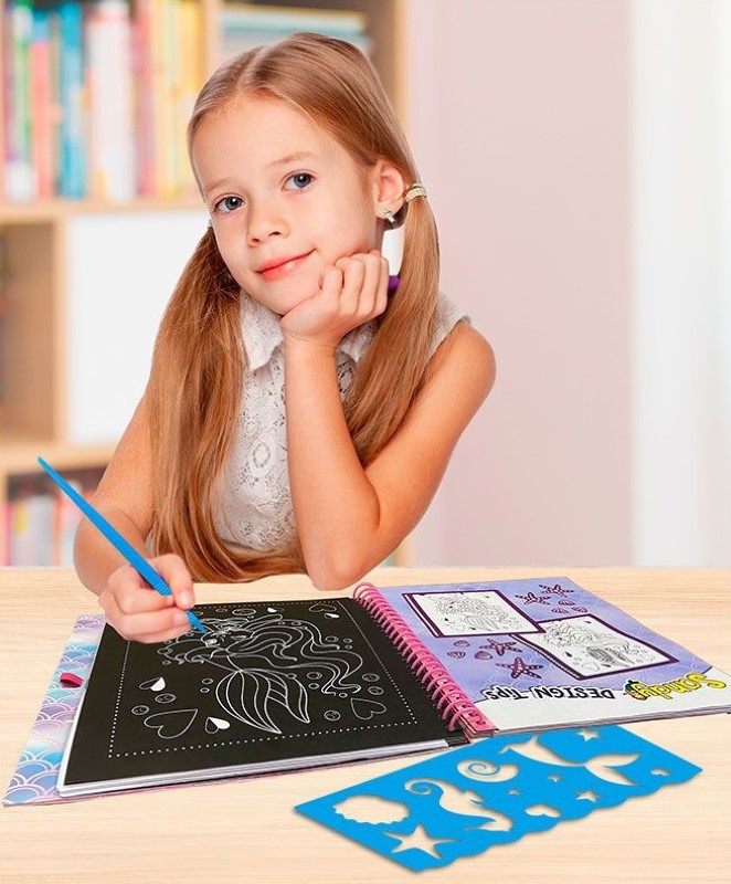 Комплект с детска чанта с русалка и скреч книжка за рисуване. Открийте магията на цветовете с функцията за надраскване: използвайте включената писалка и шаблони, за да издраскате горния черен слой от листа и да откриете живи цветове. За създаване на много дизайни с фантастични нюанси, много блясък и метални покрития.