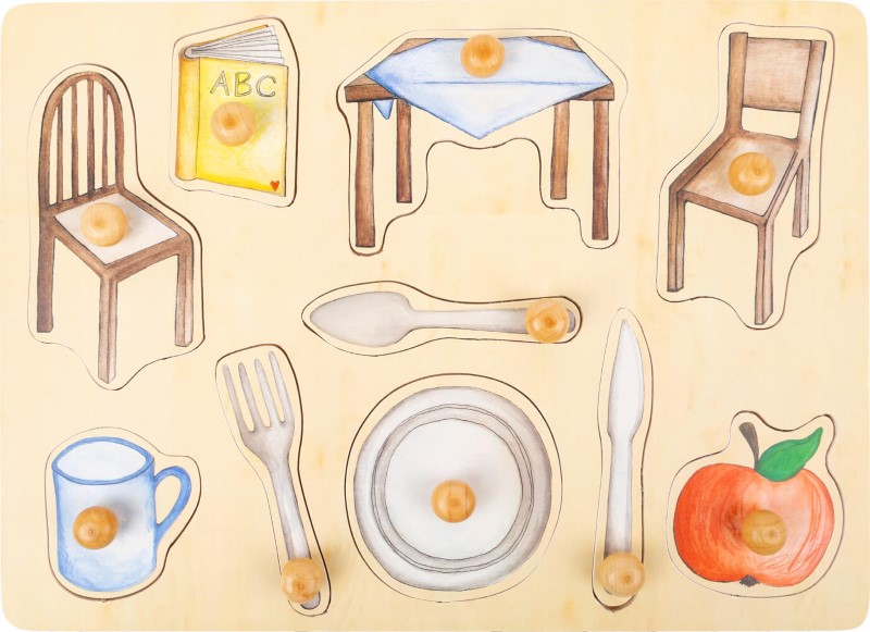 Благодарение на дървените дръжки, частите са лесни за хващане и от малките детски ръчички. Хващането тренира фината моторика, разбирането на формите и сръчността. Когато редят този пъзел, децата могат игриво да опознават ежедневни предмети като прибори за хранене или мебели.