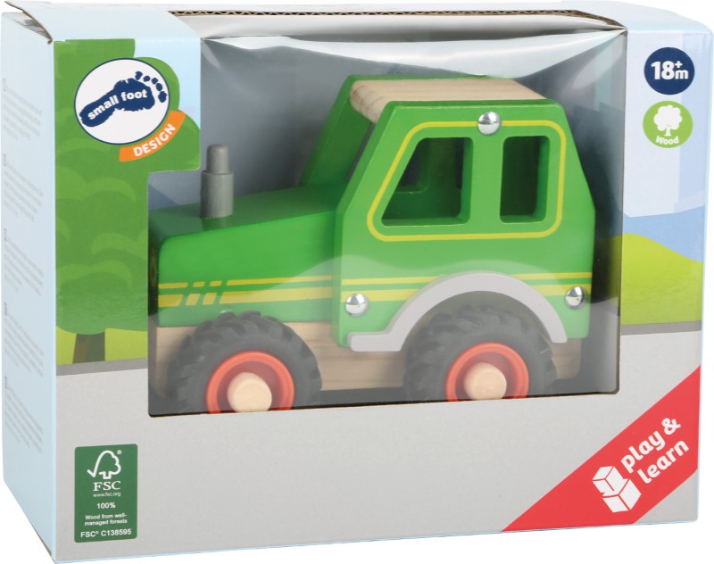 Тракторът е със здрави, гумирани колела и здравата конструкция и е в готовност за дълъг ден на полето. Децата ги очакват многобройни вълнуващи игри. Насърчава тяхната креативност и тренира фините двигателни умения. Може да се комбинира и с други превозни средства от Small Foot.
