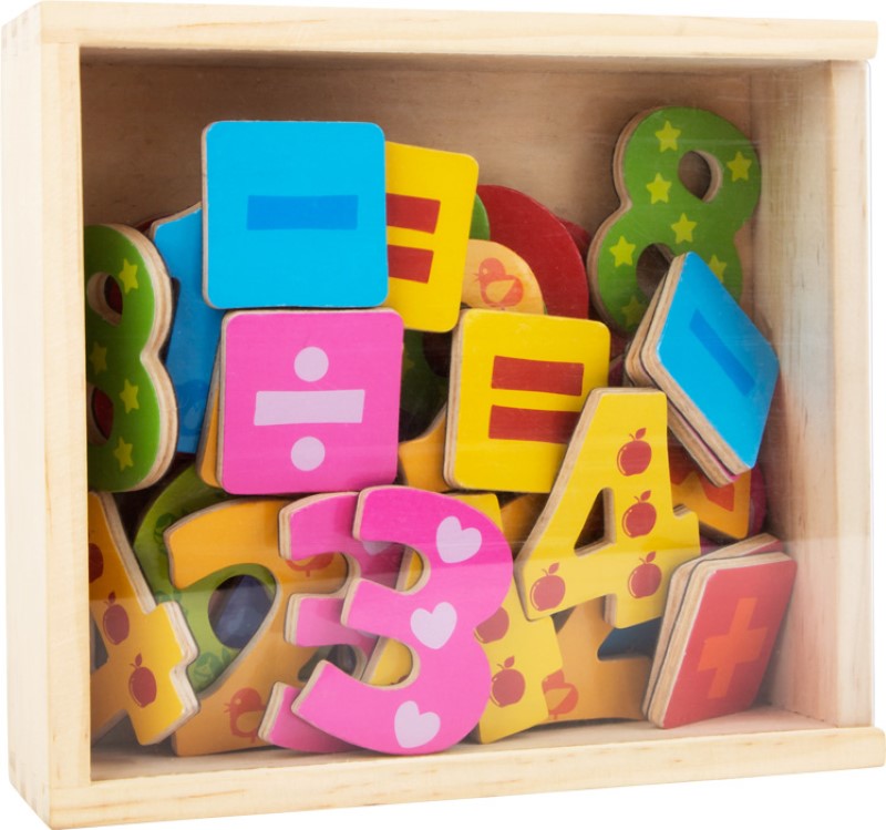 Комплектът съдържа общо 40 части – числата от 0 до 9 и допълнителни аритметични знаци, изработени от цветно боядисано дърво с магнитно покритие.
