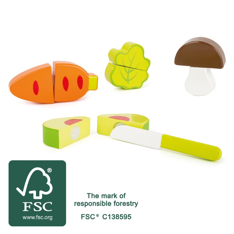 Комплектът включва 9 части – нож, морков, салата, авокадо и гъби, като всеки един от зеленчуците съдържа две части свързани помежду си с велкро, което позволява лесно да се режат с дървеното ножче, след което отново могат да се съединят в едно цяло. Този продукт е изработен от FSC® 100% сертифицирана дървесина.