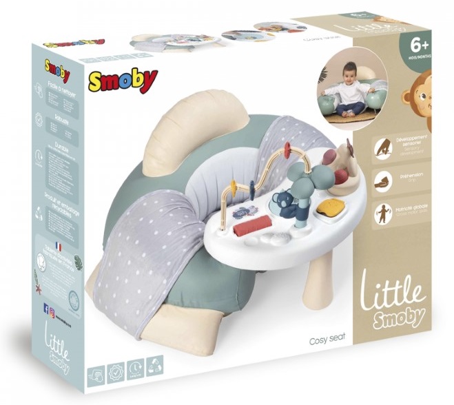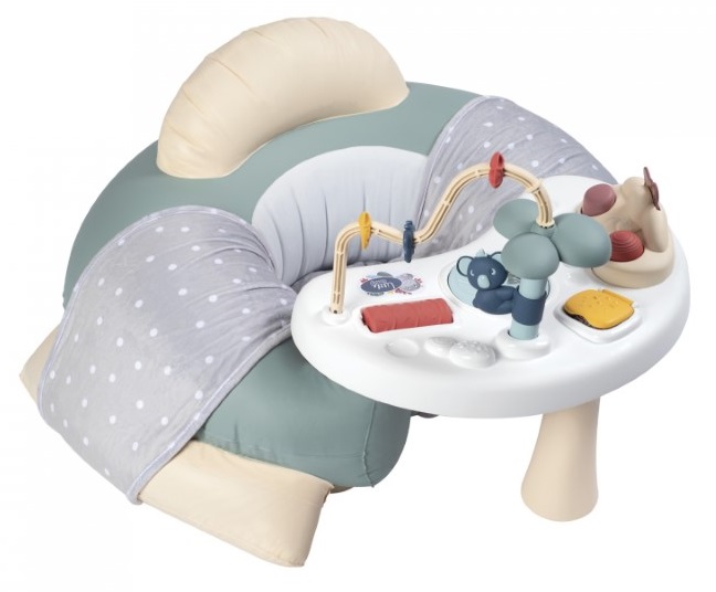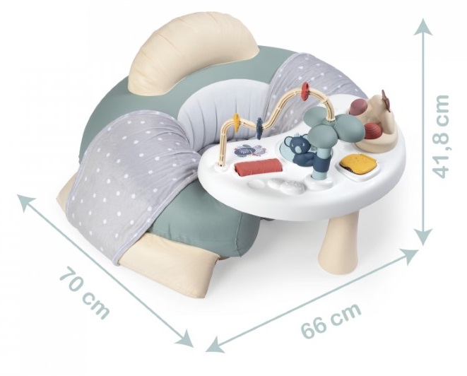 Надуваемото столче от Smoby е с подвижен плот пълен с различни образователни за бебето занимания.