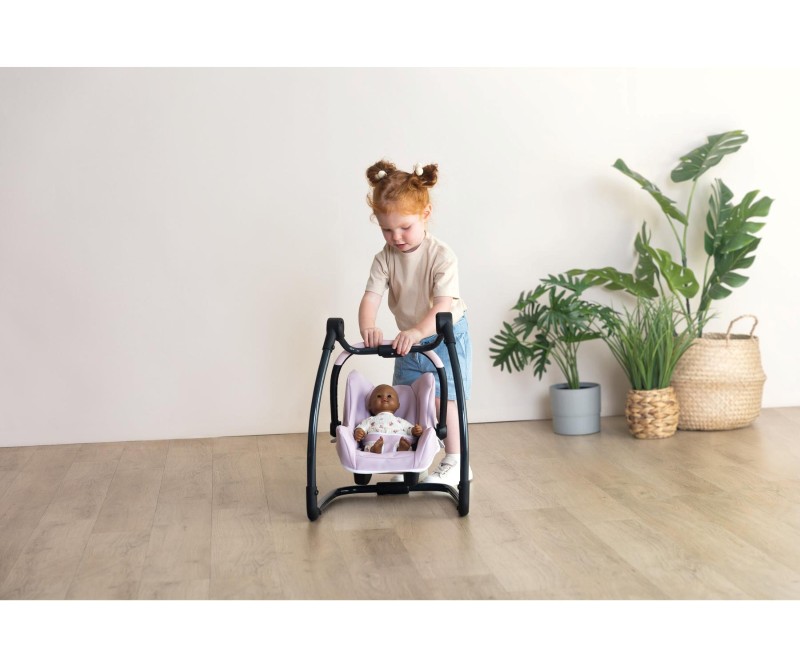 Многофункционално детско столче за кукли, което може да се използва по три различни начина – столче за хранене, люлка за кукли и столче за кола. Столчето е с регулируема дръжка за носене, предпазен колан и отделение за съхраняване на бебешки принадлежности. Рамките върху които се поставя, за да стане столче за хранене или люлка са метални и здрави.