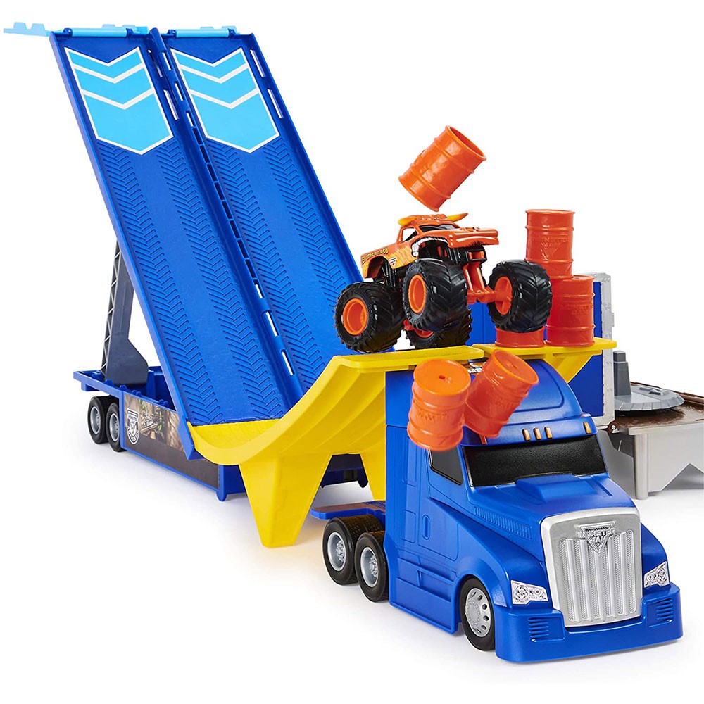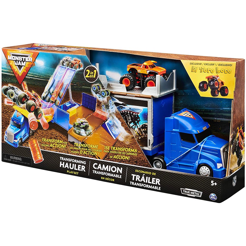 Очакват ви страхотни лупинги също като в истинското шоу! Комплектът се състои от трансформиращ се камион, които се превръща в писта с изстрелване за колички. С включените мини варели сте готови за истински екшън! С комплектът Monster Truck епичните състезания нямат край – играйте сами или с приятели. Кой ще направи най-вълнуващите лупинги? В комплектът е включена количка El Toro Loco в мащаб 1:64.