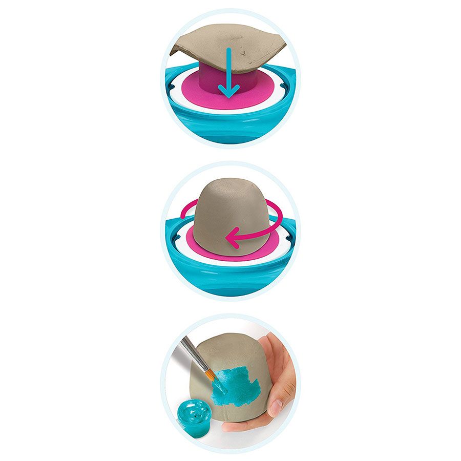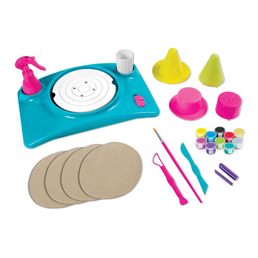 Този иновативен комплект прави изработката на глинени творби лесно, приятно и забавно – просто поставете глинен диск върху въртящия елемент и внимателно го напръскайте с вода и гледайте как се оформя в ръцете Ви!